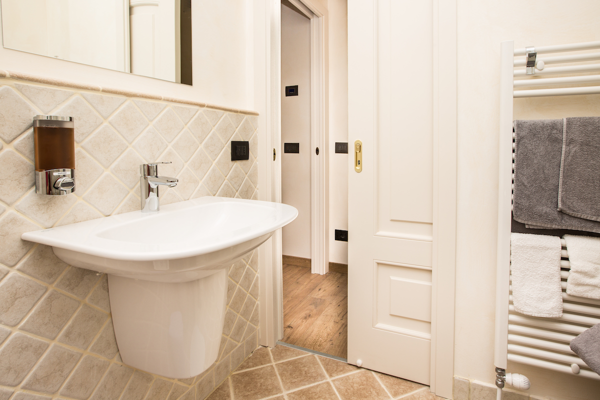 Il bagno è arredato con fini ceramiche ed è dotato di un’ampia doccia e asciugacapelli.