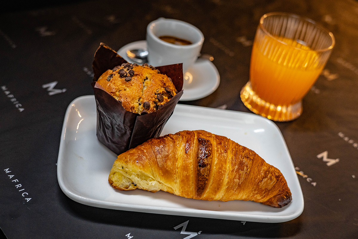 A filled croissant (chocolate, cream, pistachio) or plain, and a muffin (chocolate or mixed berries)