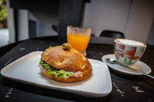 A filled brioche (chocolate, cream, pistachio) or plain, and a muffin (chocolate or mixed berries)